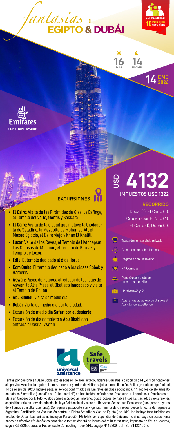 • El nombre de los hoteles estará disponible 5 días antes de la salida del viaje.