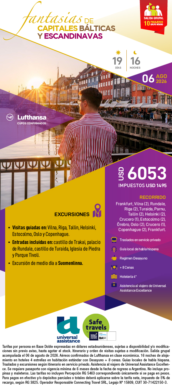 Asistencia al viajero de Universal Assistance Excellence USD 150.000 con garantía de cancelación plus hasta USD 6000 (hasta 85 años) con causa. https://www.universal-ussistance.com/files/condiciones_generales.pdf